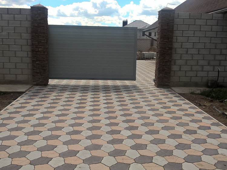 - Заказчик выбирает форму, цвет и рисунок плитки. Этот параметр зависит исключительно от предпочтений клиента. Специалисты рекомендуют ориентироваться на ландшафт двора.